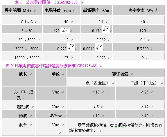 在對一般環(huán)境的電磁輻射分析中,應主要選用《環(huán)境電磁波衛(wèi)生標準》主要選用《環(huán)境電磁波衛(wèi)生標準》(GB9175-88),根據(jù)輻射源的主要輻射頻率,參照表2,找到其輻射強度限值。注意掌握三個標準限值,一般我們把居民居住的環(huán)境按一級安全區(qū)處理,則其標準限值為:在長、中、短波,電場強度應小于10V/m;在超短波段,電場強度應小于5V/m;在微波波段,其輻射功率密度應小于10μW/cm2。考慮到對在電磁輻射環(huán)境內(nèi)工作人員的保護,我們建議在職業(yè)安全衛(wèi)生領域,采用《電磁輻射防護規(guī)定》(GB8702-88)的相應限值。